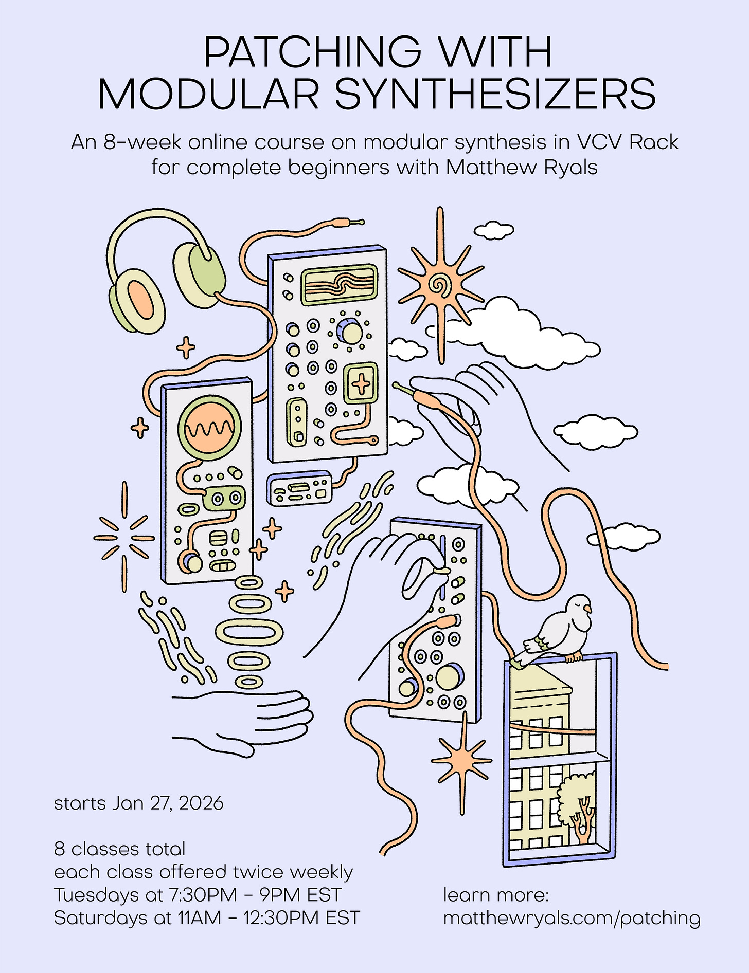 For now, I want to share a quick reminder that my online course Patching With Modular Synthesizers is open for enrollment, and classes begin next week.